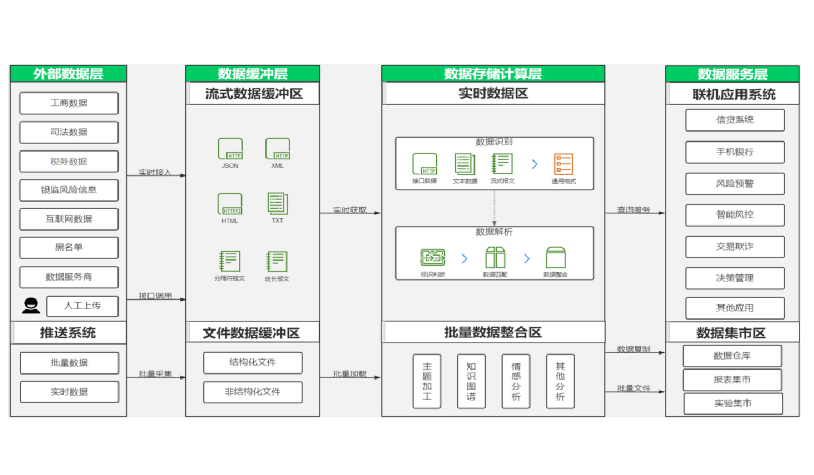 - 平台支持多源类型的数据接入,能够接入各种内外部数据源,如政府数据、行业数据、市场数据等第三方系统数据源,实现数据的多样化。顺利获得标准化接口和灵活的接入方式,平台能够快速响应业务需求,给予丰富的数据支持。经过整合后统一输出单一格式,确保数据质量和一致性
