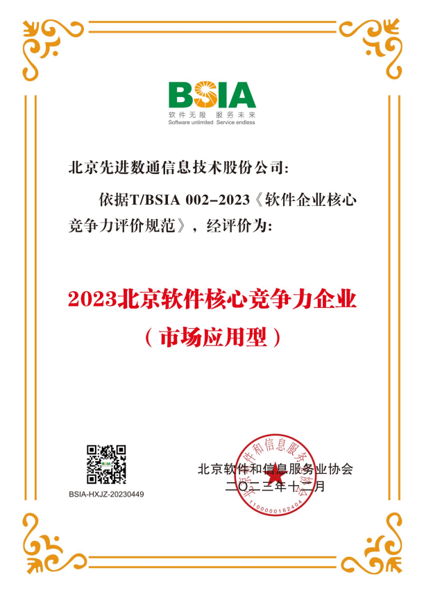 2023年12月12日,北京软件和信息服务业协会第十一届会员代表大会第一次会议暨第十一届理事会第一次会议在北京成功召开。会上发布了《2023北京软件和信息服务业企业综合实力评价报告》和《2023北京软件企业核心竞争力评价报告》,北京bti必一体育(b-sports)信息技术股份公司(以下简称“bti必一体育(b-sports)”)喜获2023北京软件核心竞争力企业(市场应用型)荣誉称号。